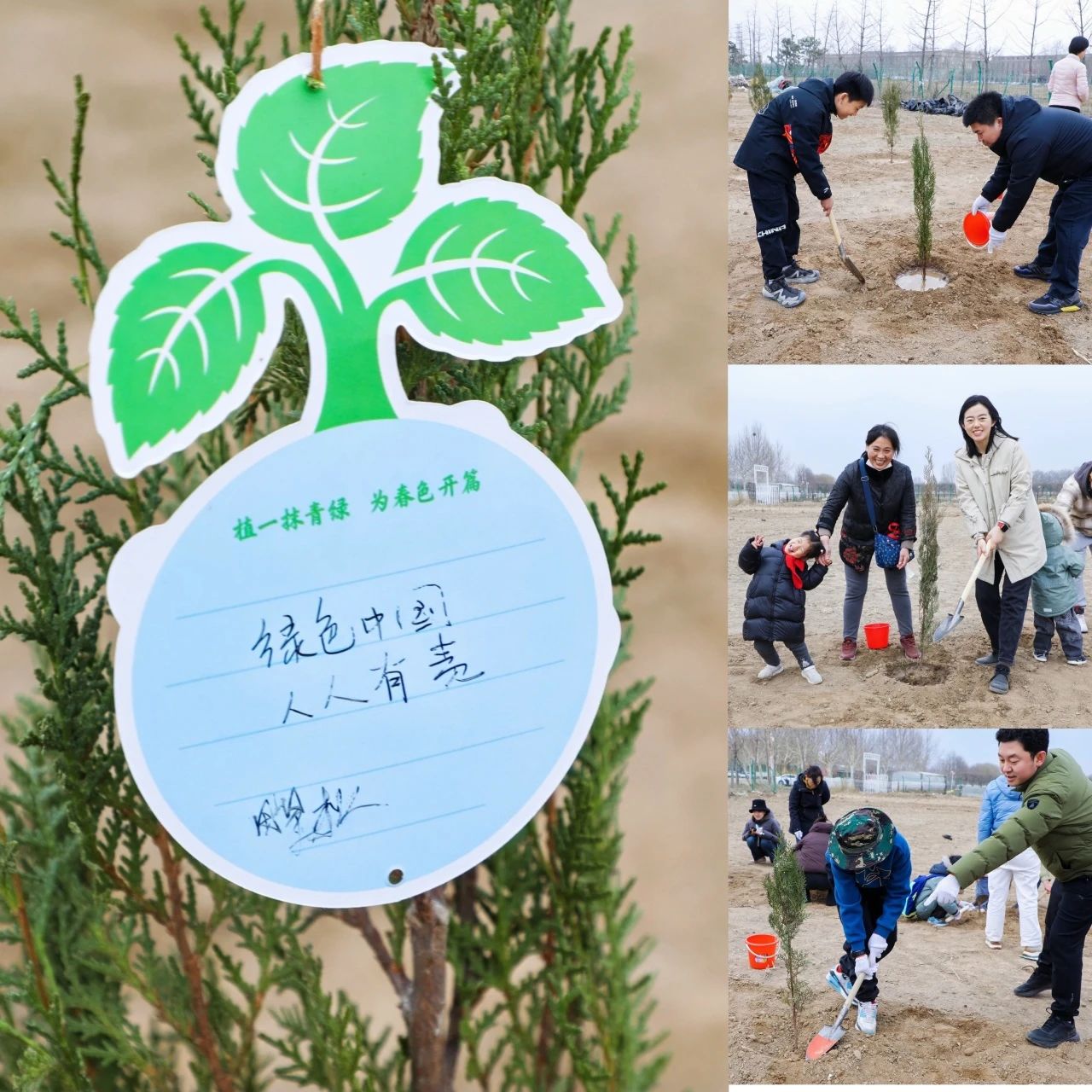 活动当天,员工们热情高涨、干劲十足,手持铁锹、水桶等工具,家庭成员分工协作。挖坑、扶苗、培土、浇水,每一个步骤都饱含着互动的温馨瞬间。孩子们为亲手栽种的小树挂上专属“成长牌”,写下“希望小树和我一起长高”的童真寄语,让绿色理念植根心间。