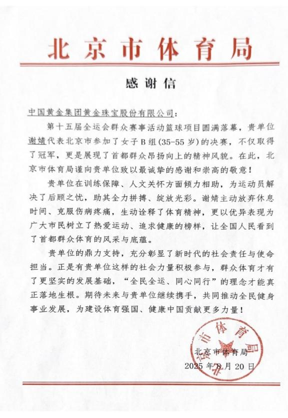 赛事圆满落幕后,中金珠宝收到了来自北京市体育局的感谢信。信中对谢婧同志“展现了首都群众昂扬向上的精神风貌”给予高度赞扬,并特别感谢中金珠宝在“训练保障、人文关怀方面倾力相助,为运动员解决了后顾之忧”。这份来自赛事主办方的认可,既是对谢婧个人拼搏精神的肯定,也是对中金珠宝团队支持保障工作的充分赞誉;不仅展现了新时代央企职工的综合素质,更体现了中金珠宝倡导的团结协作、共创价值的良好氛围。