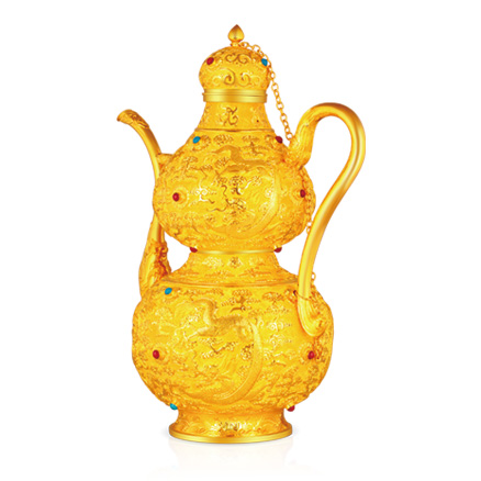 以故宫馆藏錾云龙葫芦式金执壶为原型。整体呈葫芦形,直口短颈,外撇式圈足,壶身通体錾刻云纹,云海中錾二龙戏珠纹,执壶有盖,盖及壶身镶嵌宝石共计32颗。